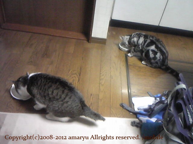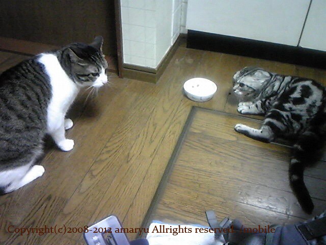 3日前から、朝、晩の猫たちのお食事タイムには、おたがいの顔を見せながら